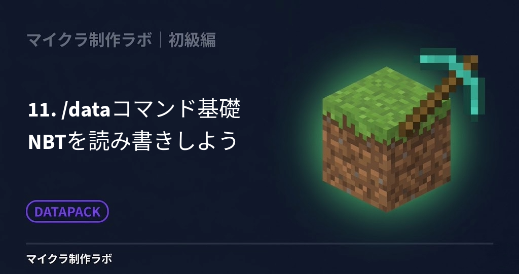 前回はアドバンスメントを使って「特定のアイテムを入手した瞬間にfunctionを自動実行する」仕組みを作りました。今回はその先へ進んで、エンティティやブロック・ストレージが内部に持つデータを /data コマンドで読み書きする方法を学びます。あわせて、... -